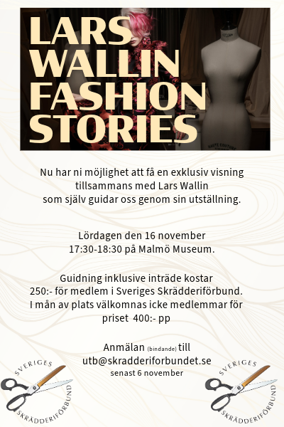 Visning Lars Wallin Fashion Stories 15 10 24 Länk till inbjudan i .PDF Anmälan till utb@skradderiforbundet.se Mer information om utställningen hittar du här Startdatum 2024-10-16 Slutdatum 2024-10-16 Time: 17:30-18:30 Kurshållare Lars Wallin Plats Malmö Museum Website Kontaktinformation utb@skradderiforbundet.se